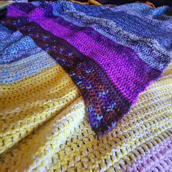 The price of a piece is based on the cost of the yarn, plus time/intricacy of the piece. Acrylic yarns are typically much less expensive (and have easier care requirements) than natural fibers. As for time, intricate knitted pieces can take dozens or hundreds of hours compared to straight-forward crochet. When you're looking at a hat and a blanket and wondering why they are both $40, its yarn plus time. The exception to this is "The Yarn Hoard" (see below).